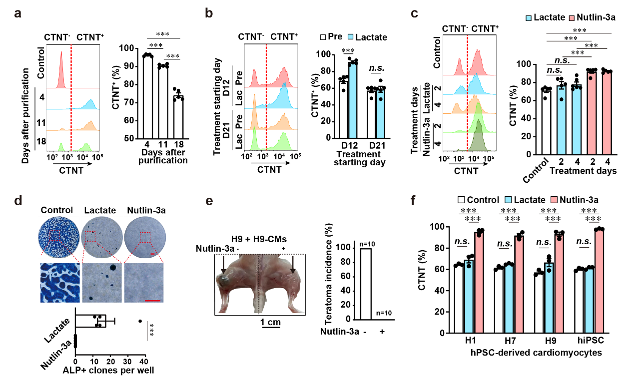 圖注:簡便高效的hPSC-CMs的純化方法。a,長時間培養(yǎng)的hPSC-CMs純度下降。b,乳酸純化法對分化第21天的hPSC-CMs純化作用微弱。c,nutlin-3a可用于長時間分化的hPSC-CMs純化。d,nutlin-3a相比乳酸純化方法有更好的去處未分化hPSCs效率。e,nutlin-3a純化的心肌細(xì)胞移植免疫缺陷型小鼠無畸胎瘤形成。f,nutlin-3a可用于多種hPSC系來源的心肌細(xì)胞。