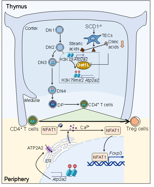 硬脂酰輔酶A去飽和酶(stearoyl CoA desaturase, SCD)是催化來源于食物或者從頭合成的飽和脂肪酸轉變?yōu)閱尾伙柡椭舅幔ㄓ退崤c棕櫚油酸)的限速酶。其中,人類基因組中的2個SCD基因均與小鼠SCD1基因高度同源。研究發(fā)現,SCD1缺失顯著促進小鼠外周血、淋巴結以及主要組織器官中Foxp3+ Treg的數量與比例,并賦予其抵抗自身免疫性疾病的能力,這一現象與SCD1缺失促進初始CD4+ T細胞向Treg分化密切相關。利用條件性敲除小鼠、骨髓移植、胸腺移植和T細胞體外發(fā)育等體系,研究揭示SCD1在胸腺上皮細胞中的缺失是導致初始CD4+ T細胞向Treg的分化傾向性增加的主要原因,而非SCD1在T細胞中缺失所引起。更為重要的是,胸腺上皮細胞油酸的可利用性影響初始CD4+ T細胞向Treg分化潛能的關鍵窗口期是胸腺細胞DN2向DN3的發(fā)育階段。在油酸缺乏的胸腺微環(huán)境中,胸腺細胞內表觀遺傳修飾酶DOT1L活性上調,借以H3K79me2修飾促進DN3胸腺細胞中Atp2a2基因座的染色質開放水平。這一表觀遺傳學印記從DN3階段一直保留至初始CD4+ T細胞,使其在接受T細胞受體激活信號時,通過ATP2A2——calcium——NFAT——Foxp3信號軸促進其向Treg分化。該項研究首次揭示胸腺基質微環(huán)境中的油酸信號影響和預編程外周T細胞亞群分化偏好性的細胞與分子機制,不僅為理解不同生理病理環(huán)境中T細胞免疫調控機制提供了新視角,也為Treg的定向高效誘導及其在器官移植、自身免疫性疾病等治療中的應用提供新策略與新方向。